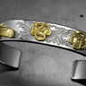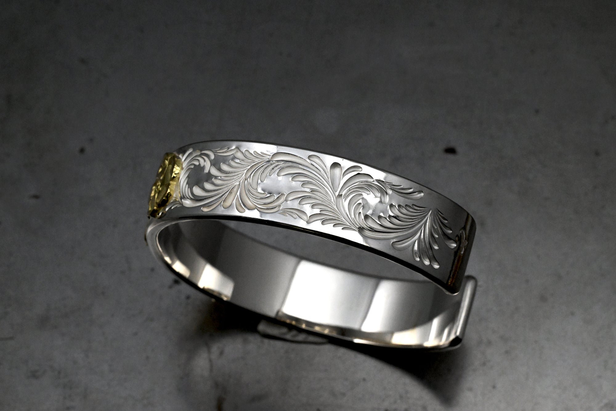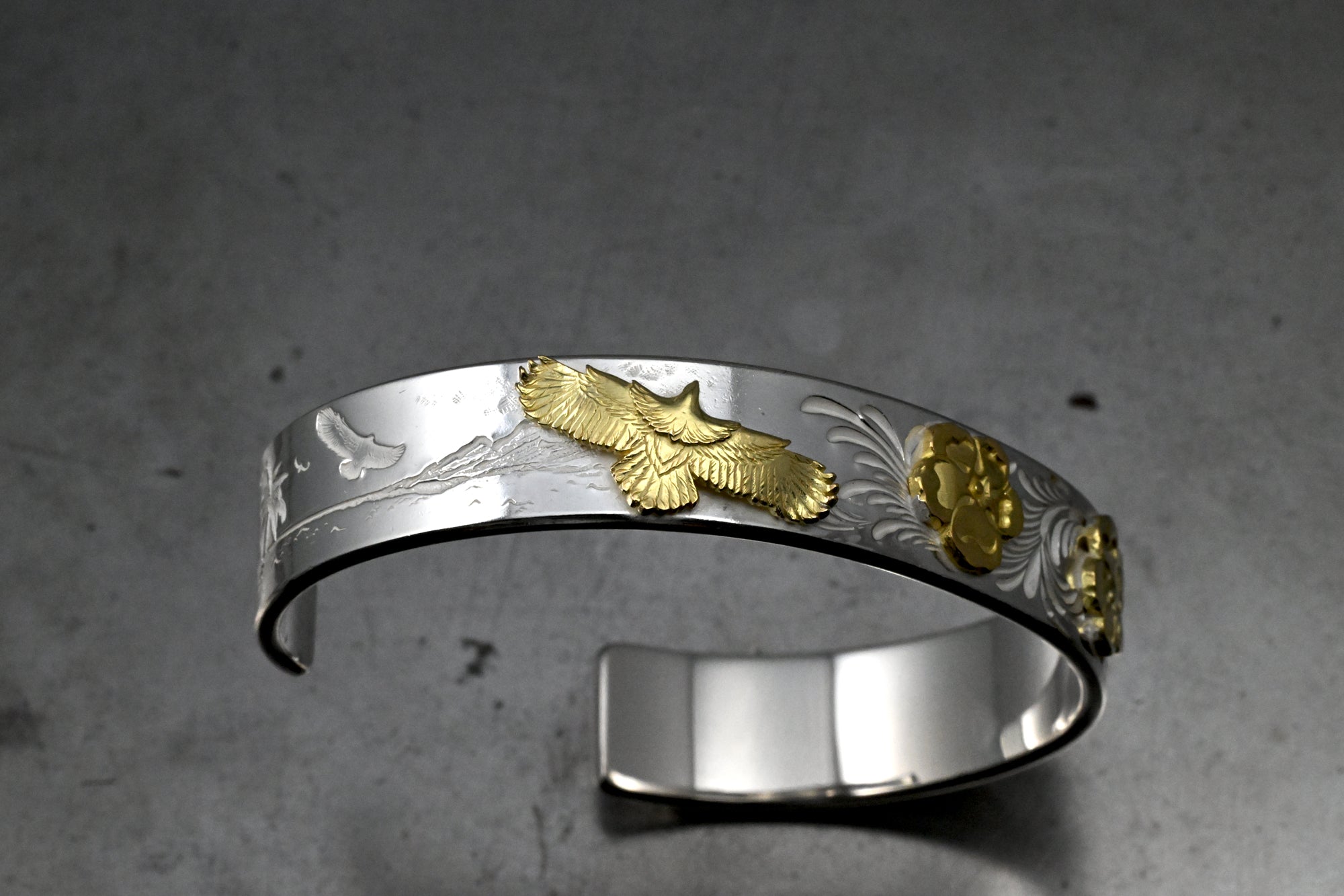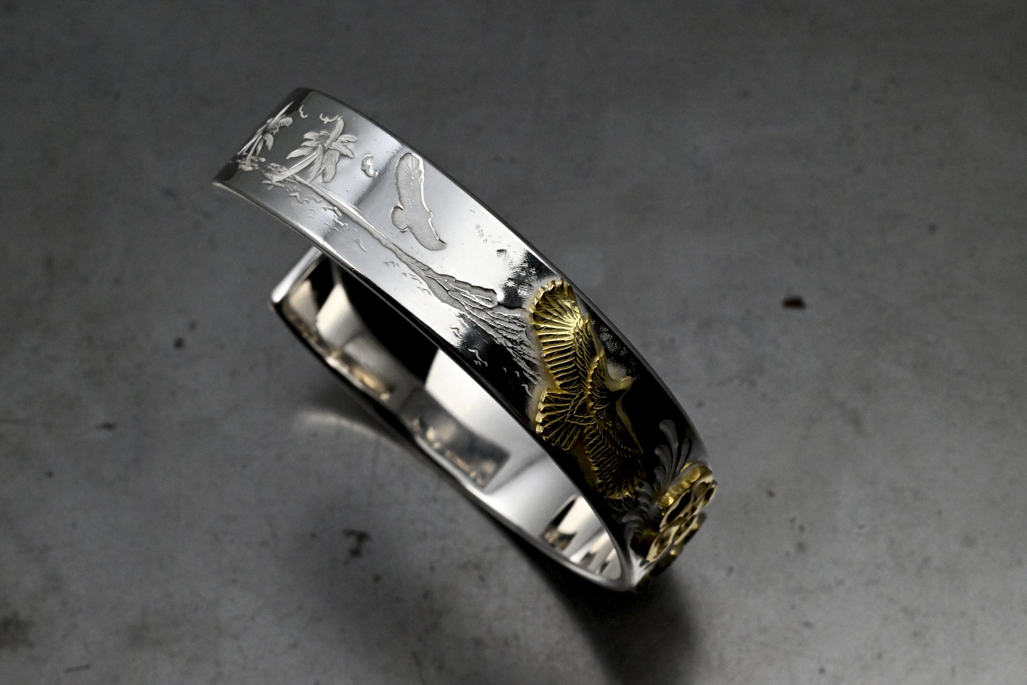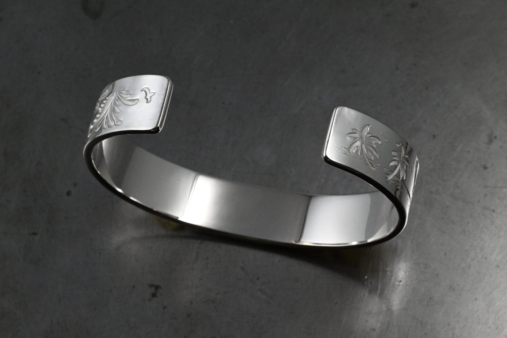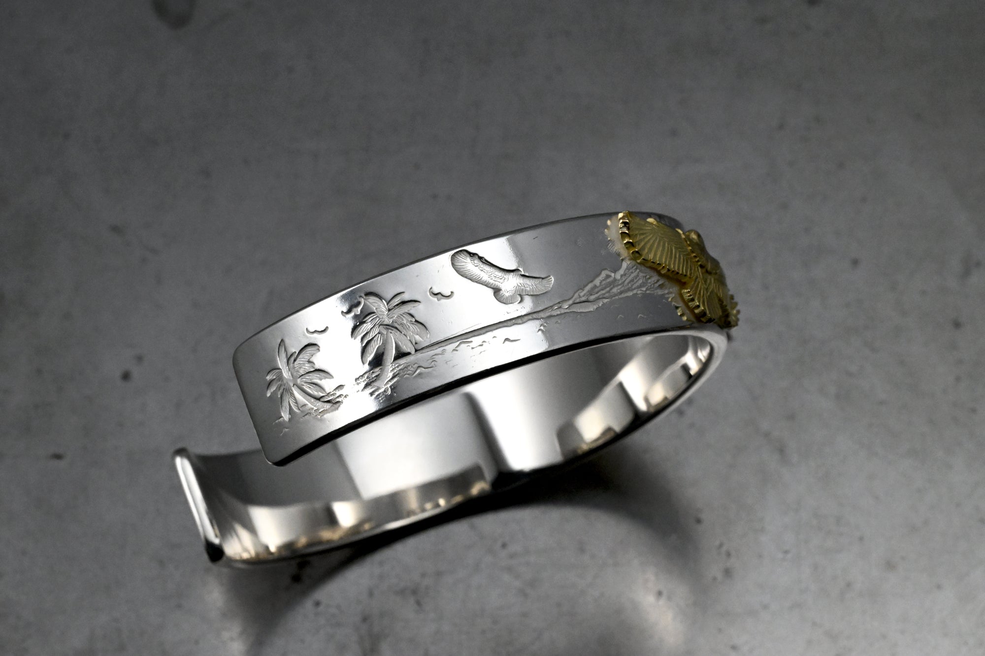 12mm幅の板に手彫りで唐草とビーチの風景をデザインし、ハイビスカスメタルと小さいイーグルを組み合わせた夏を感じるバングル。